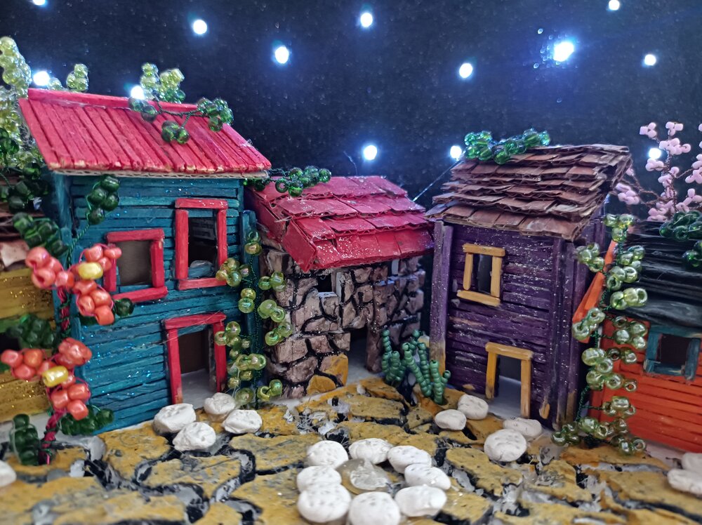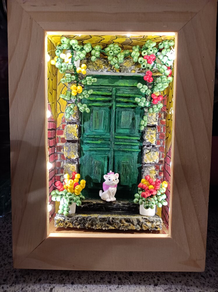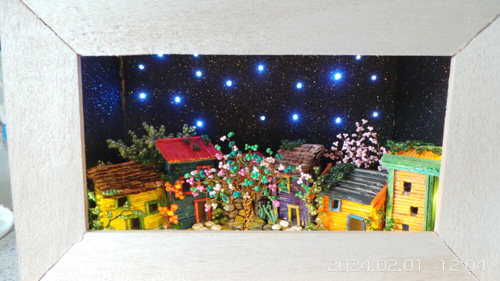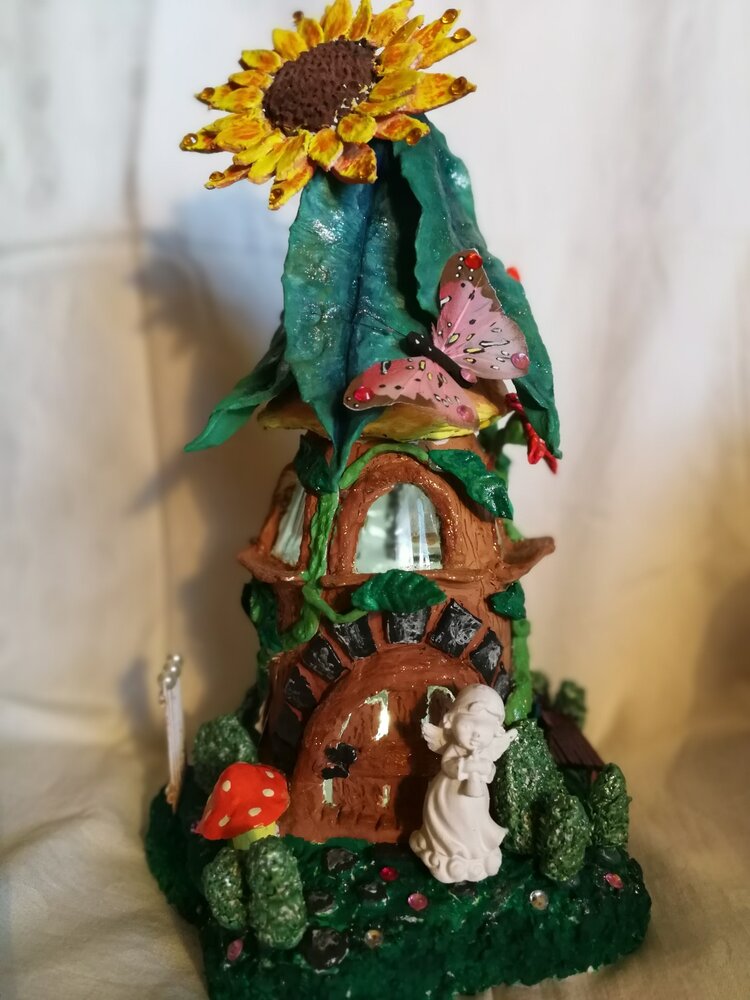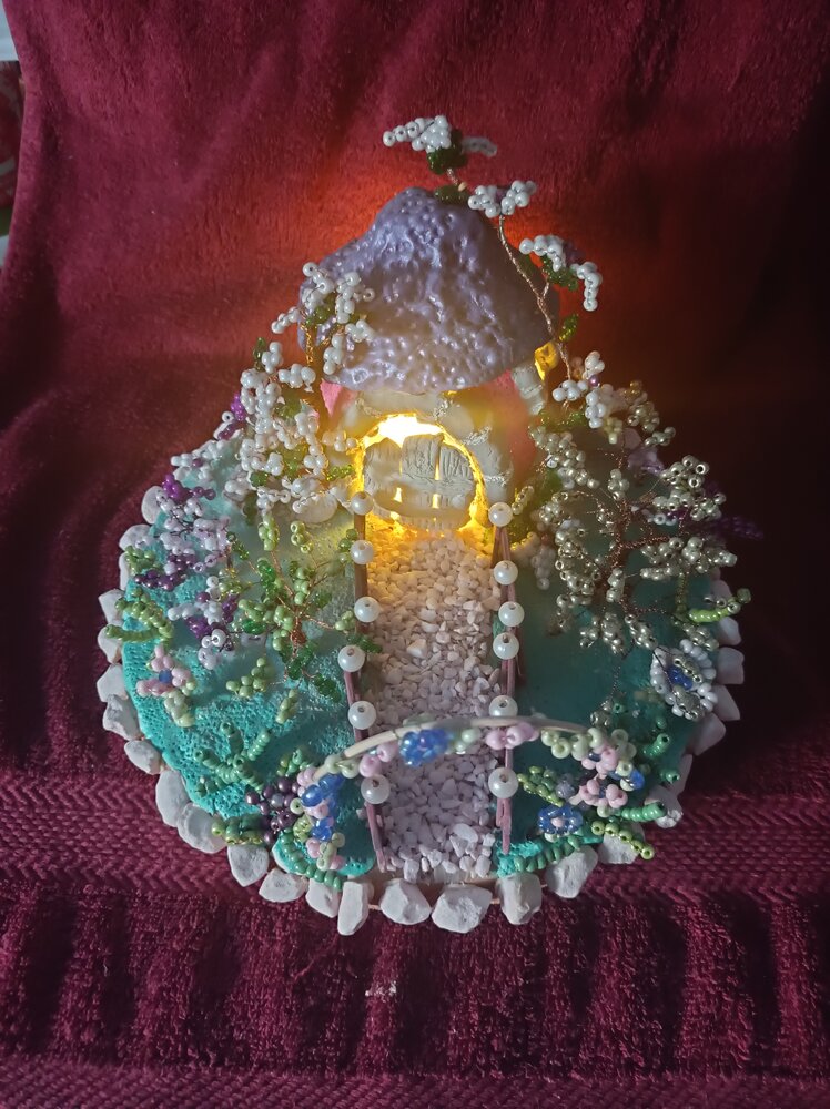 Ez egy világítós tündérház kerttel körülvéve. A kert növényei gyöngyből készültek.
